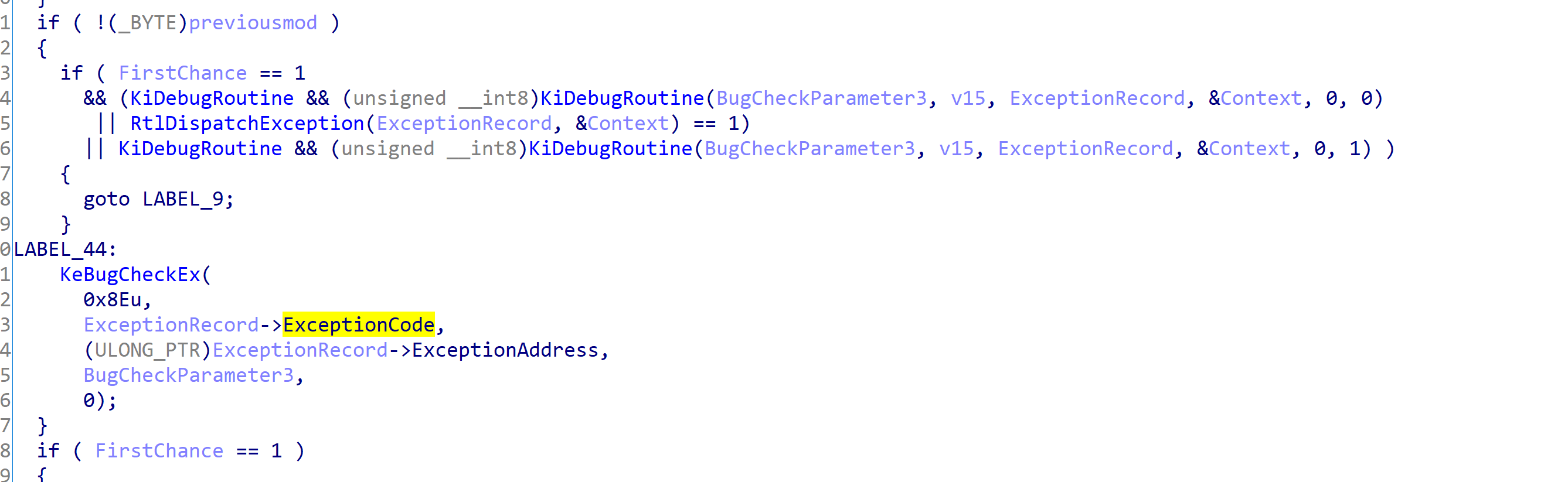 首先判断先前模式 0是内核层1是用户层,仅接着判断是否是第一次调用,然后再看是否有内核调试器,没有或者内核调试器不处理就调用RtlDispatchException,返回false的话再次判断是否有内核调试器 有则调用,没有直接蓝屏