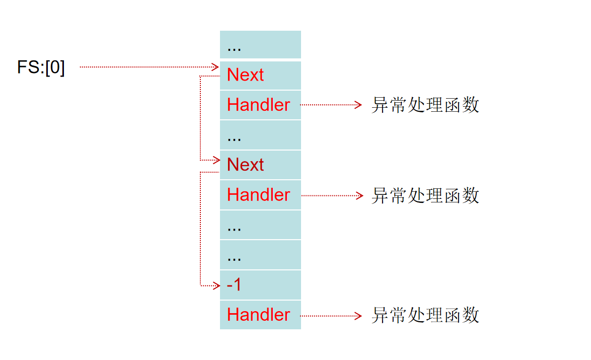 遍历异常链表,没错就是FS:[0]那的,调用异常处理函数,如果被处理了函数返回值为1,如果该异常处理函数不能处理则调用下一个,直到next指针为0xffffffff,如果没有函数能够处理该异常则返回0.
