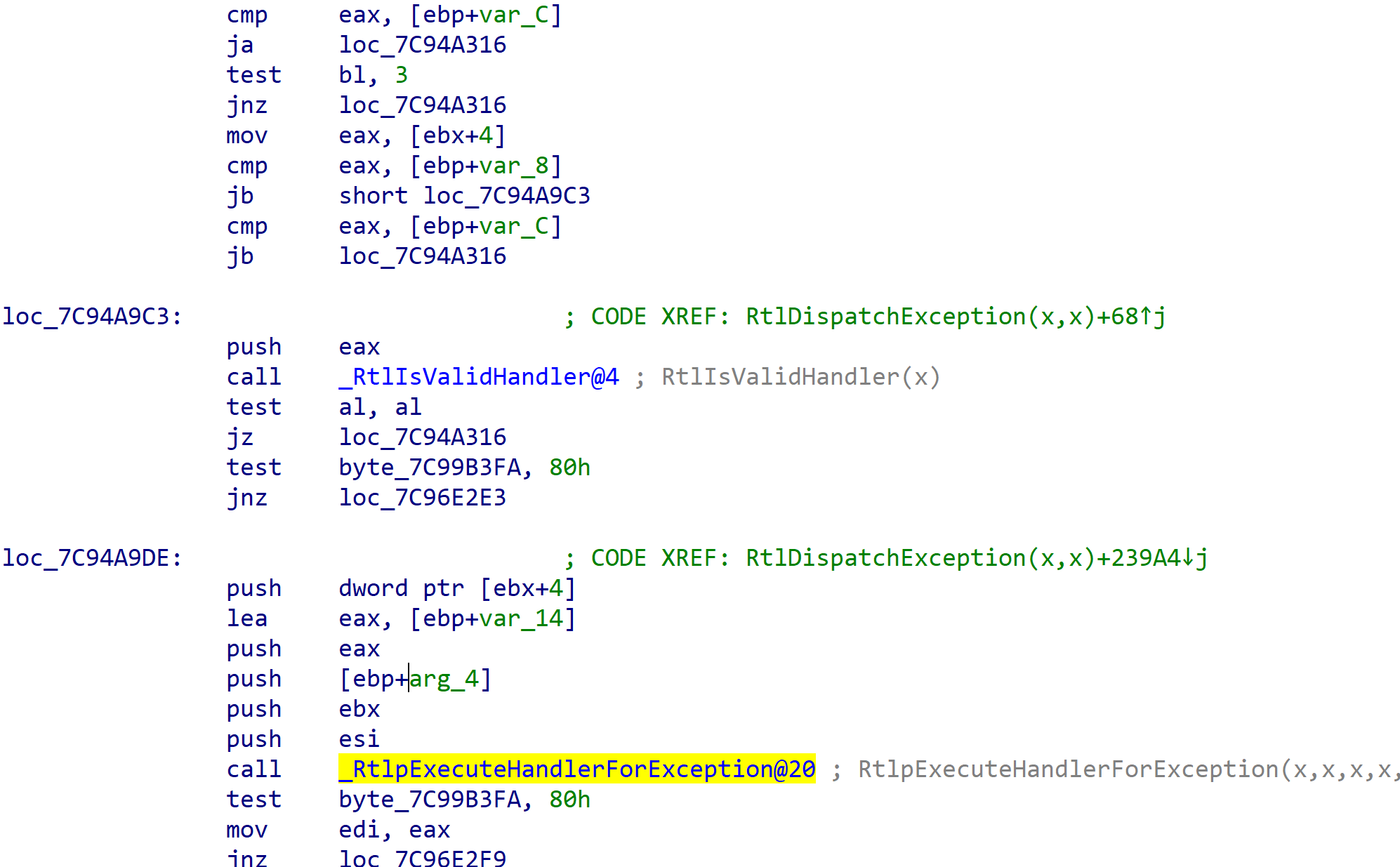 下面看看RtlDispatchException,这个就是我们”熟悉”的异常处理了