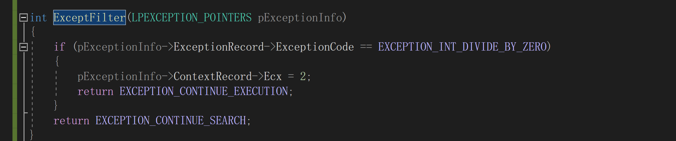 long _stdcall ExceptFilter(LPEXCEPTION_POINTERS pExceptionInfo) { if (pExceptionInfo->ExceptionRecord->ExceptionCode == EXCEPTION_INT_DIVIDE_BY_ZERO) { pExceptionInfo->ContextRecord->Ecx = 2; return EXCEPTION_CONTINUE_EXECUTION; } return EXCEPTION_CONTINUE_SEARCH; }